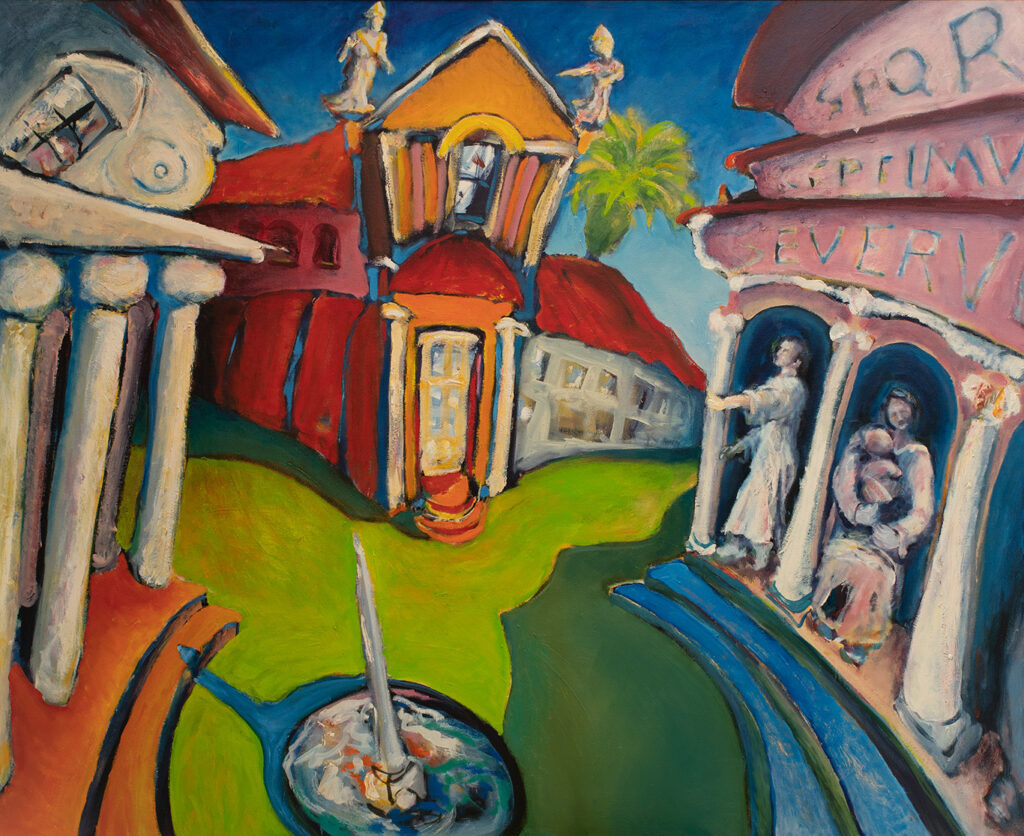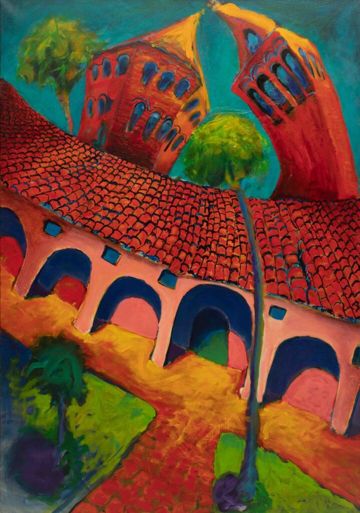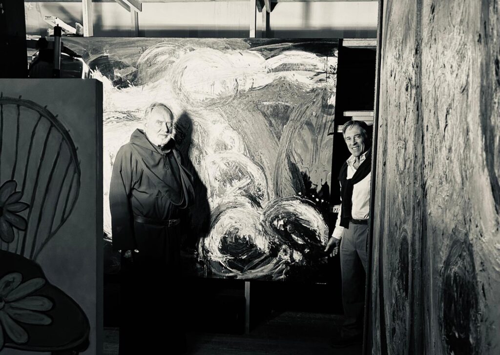 Fue en ese escenario —entre arcos que resignifican la memoria y pasillos que parecen trazar un mapa secreto— donde se produjo el encuentro que cambiaría el rumbo de una mirada. León de la Vega y el Padre Jerome Tupa, OSB, monje benedictino, sacerdote, profesor de francés y pintor —una combinación que suena a paradoja hasta que uno contempla sus obras.